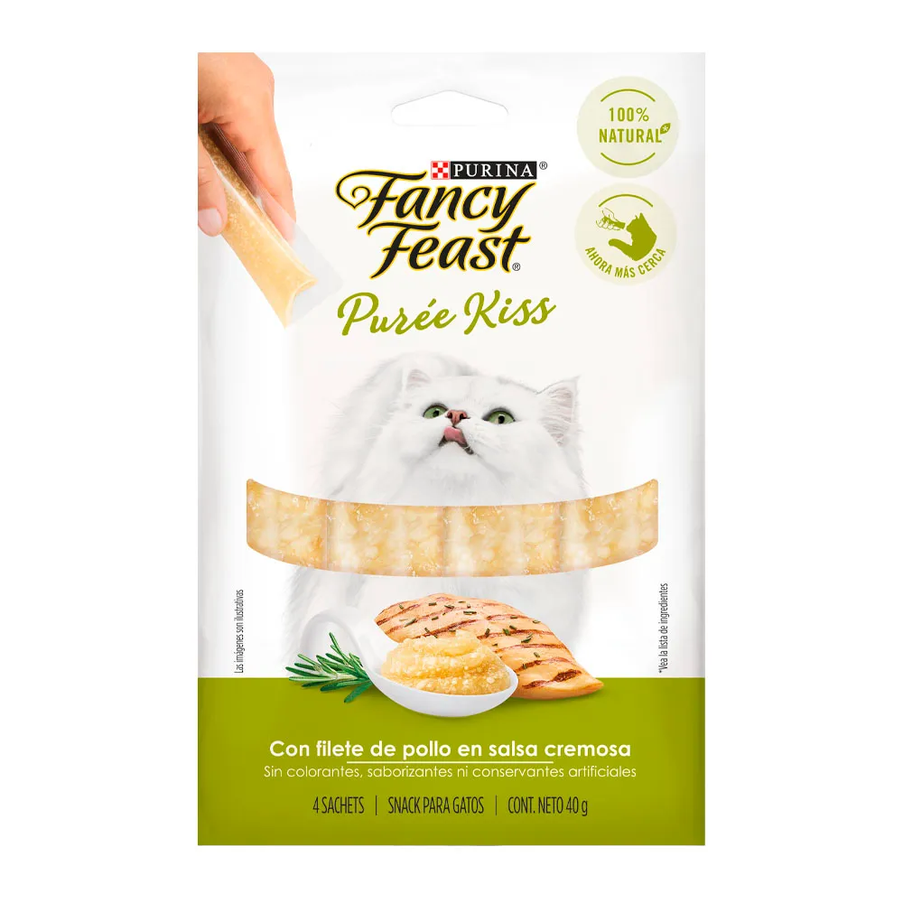 Fancy Feast Puree Kiss con filete de pollo en salsa es un snack líquido para gatos hecho con ingredientes seleccionados, grain free, sin colorantes, sin saborizantes ni conservantes artificiales, con un gran sabor que a tu gato le encantará.