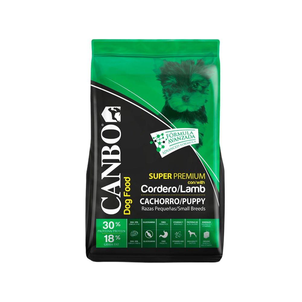 nformacion del Producto : Canbo es un alimento super premium, 100% completo y balanceado, elaborado con ingredientes de alta calidad que cubren las necesidades nutricionales de la mascota en cada etapa de vida. Esta presentación esta especialmente formulada para cachorros (0-12 meses) de razas pequeñas. Su fórmula esta compuesta por prebióticos MOS, betaglucanos, DHA, EPA, fibra prebiótica, yuca schidigera, vitaminas, minerales orgánicos y glucosamina. Características: Proteína Grasa Fibra Humedad Calcio Fósforo Beneficios: Desarrolo del sistema nervioso central Piel sana y pelaje resistente Fortalecimiento del sistema inmune Crecimiento y desarrollo Alta digestibilidad Proteccion y fortalecimiento de articulaciones Ficha Tecnica: Marca Canbo Alimento para Perros Peso 1 KG